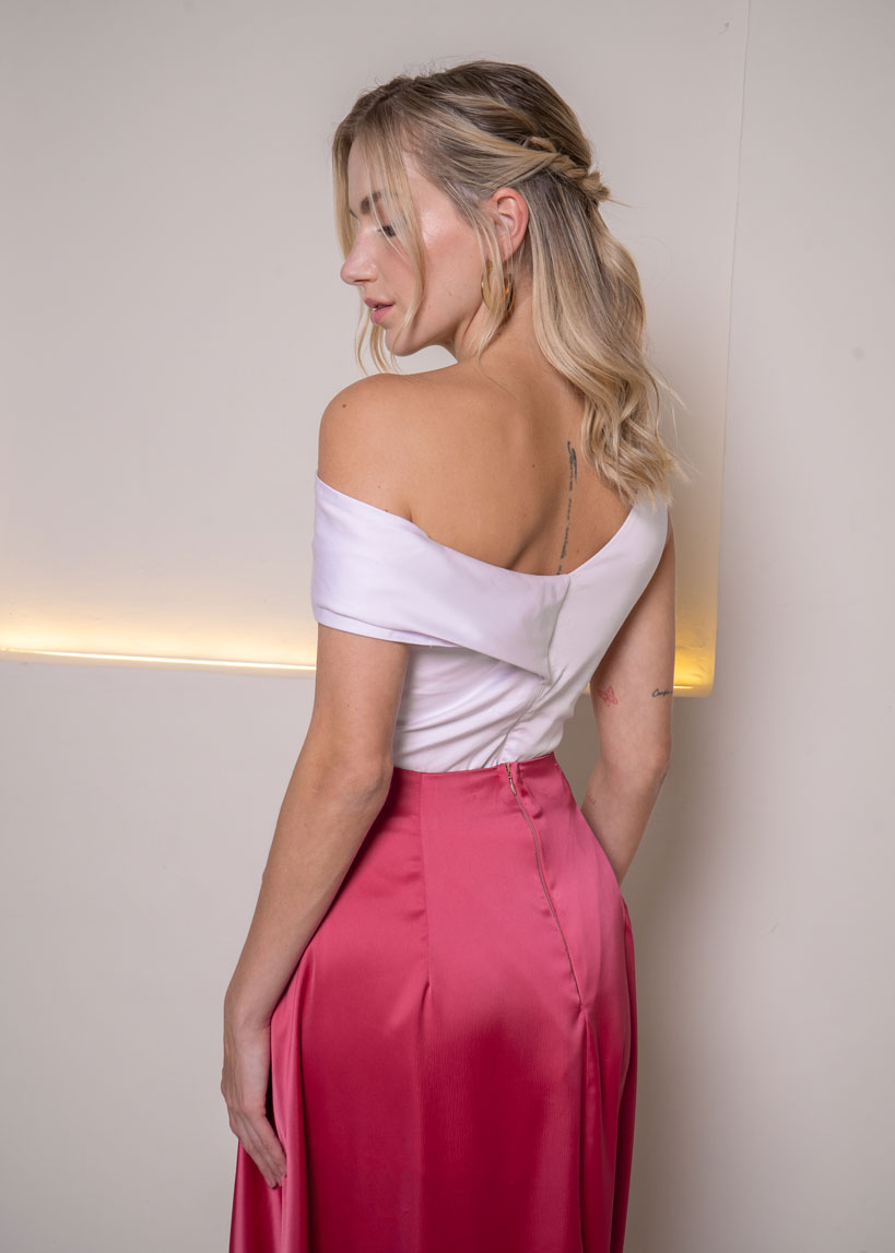 Blusa elaborada en tafetan con escote bandeja y cremallera al centro de la espalda.