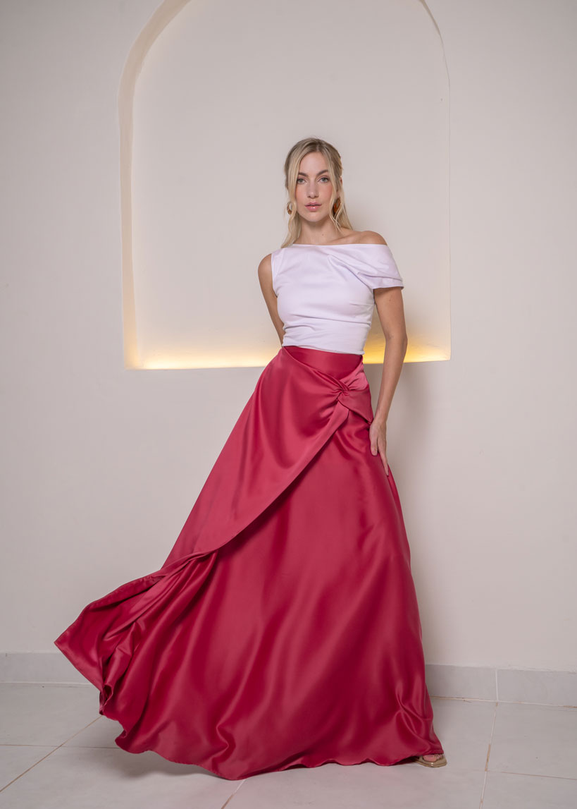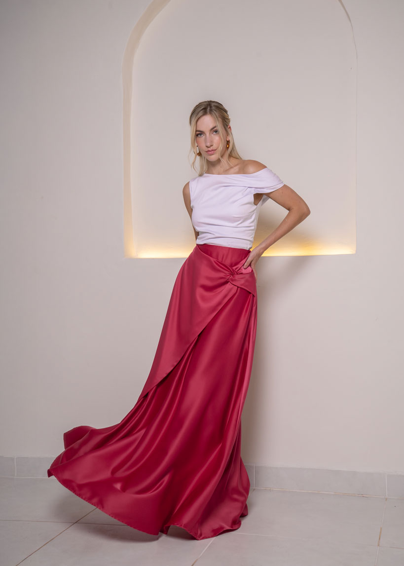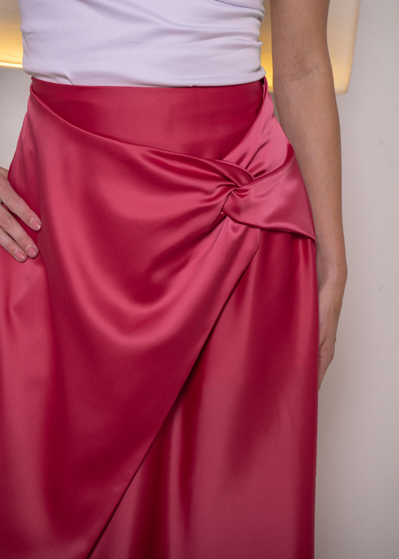 Falda elaborada en seda, delantero cruzado con ligeros pliegues, falda forrada con abertura lateral, cremallera en el centro de la espalda.