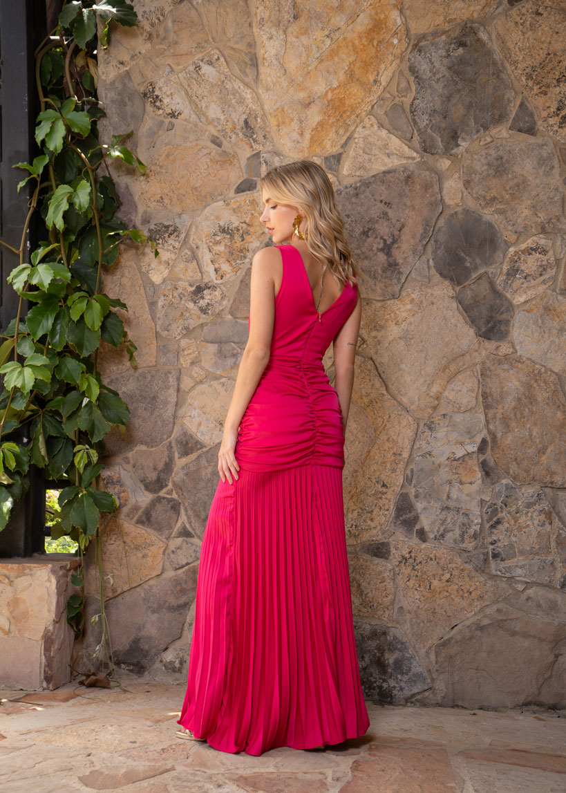 Vestido elaborado en seda satinada, escote drapeado, hermosa falda tallada con fruncido y plisado, cremallera en el centro de la espalda.