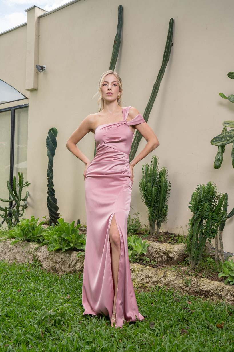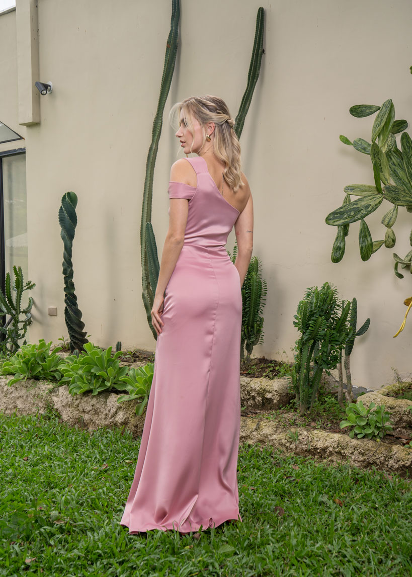 Vestido elaborado en seda, corte ceñido al cuerpo con falda ligeramente amplia con abertura, cremallera al centro de la espalda.