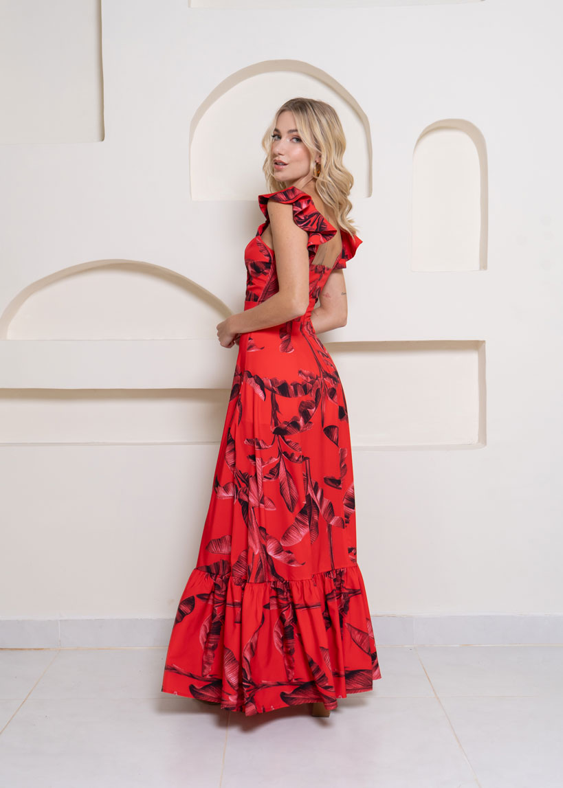 Vestido elaborado en seda estudio matte, falda semirotonda con gola en ruedo, apertura en falda y cremallera en el centro de la espalda.